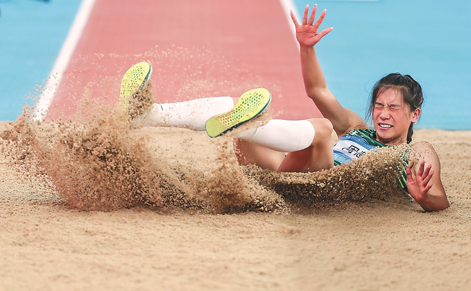 11月16日,江苏队选手周慧在三级跳远比赛中。(新华社发)