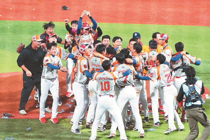 11月20日,江苏队成员在棒球比赛后庆祝卫冕。 (新华社发)