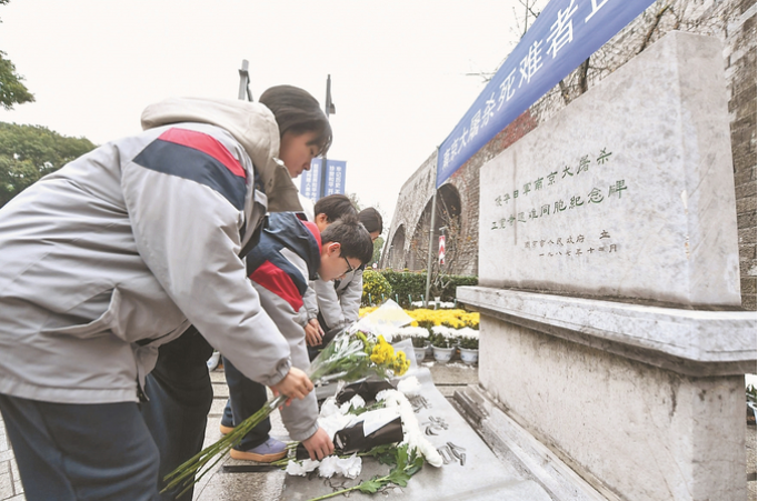 12月13日上午,南京市民自发来到南京大屠杀死难者正觉寺丛葬地,通过敬献菊花、默哀鞠躬等方式表达哀思。本报记者 邵丹 摄
