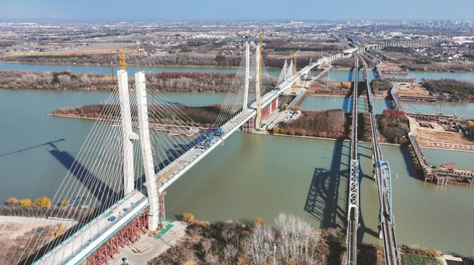 近日,由中国铁建大桥局承建的沪渝蓉高铁通泰扬特大桥跨京杭运河斜拉桥顺利合龙,通泰扬特大桥控制性工程取得突破性进展。图为合龙施工现场。齐立广 摄 (视觉江苏网供图)
