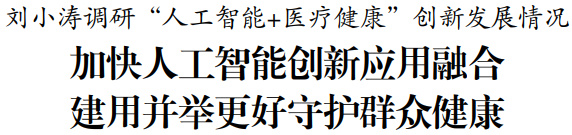 本报讯 (记者 王拓 李嘉豪) 1月7日,省长刘小涛调研“人工智能+医疗健康”创新发展情况。他强调,要深入学习贯彻习近平总书记关于人工智能发展和健康中国建设的重要论述,认真落实省委经济工作会议部署,深入实施“人工智能+”行动,坚持创新驱动、安全可控,坚持建用并举、以用促建,以新基础设施、新技术体系、新产业生态推动人工智能与医疗健康领域深度融合,更好地满足群众日益增长的健康服务需求。