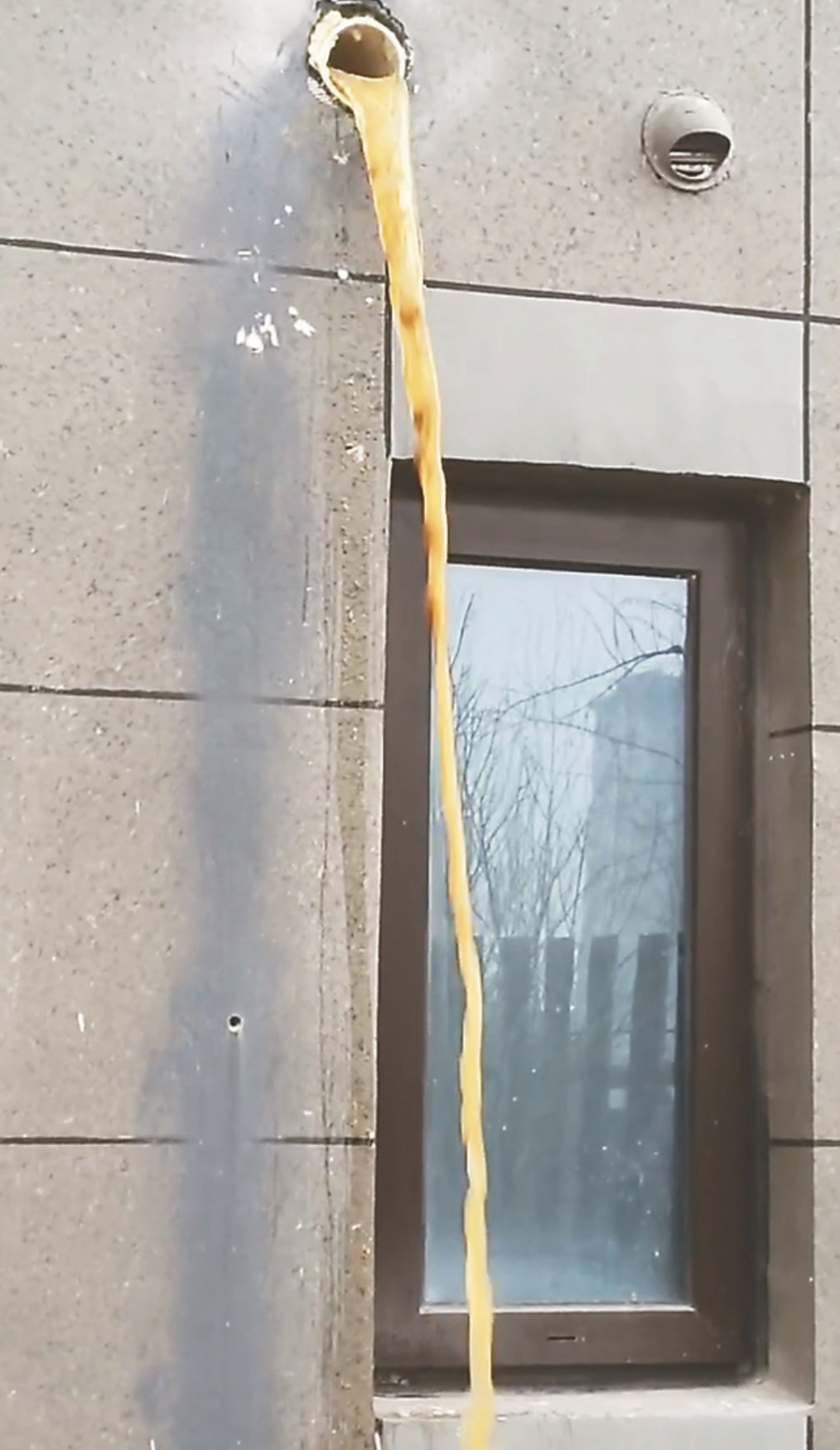 记者沿104室外墙查看,发现北侧和西侧窗户上方约50厘米处,各有一个排污洞,分别对应204室北卫生间和西卫生间。但北卫生间排污洞下方,并无明显污渍。对此,刘老师解释说,去年4月,外挂管道拆除后,有一定倾斜角度的弯头还在,直排的污粪水很容易喷溅。在她一再投诉下,204室北卫生间去年10月起弃用停排,所以看不到污渍。而西卫生间排污洞虽经“防溅处理”,即社区于去年12月1日将排污口弯头去掉,污粪水下来虽溅不到窗户上,但直排一天也没停止过。