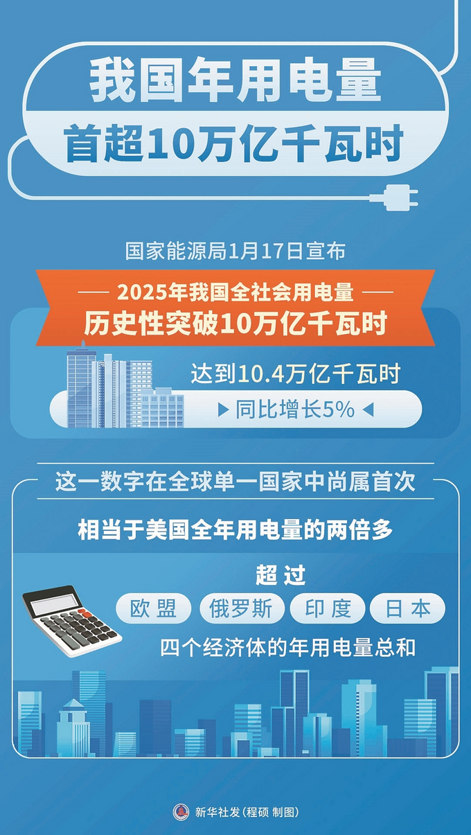 杨昆说,10万亿千瓦时印证了我国制造业的坚实底盘与民生电气化水平的稳步提升,更折射出能源供给体系的升级与新型电力系统建设的成效。10万亿千瓦时背后,是产业结构向高技术、高附加值迈进的铿锵步伐,是绿色低碳转型的坚定方向,更是中国经济行稳致远、韧性十足的有力证明。(新华社北京1月17日电)