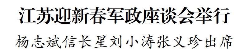 本报讯 (记者 黄伟) 2月13日,2026年江苏迎新春军政座谈会在南京举行。东部战区司令员杨志斌,省委书记、省人大常委会主任信长星,省委副书记、省长刘小涛,省政协主席张义珍等军地领导欢聚一堂,畅叙军民鱼水深情。