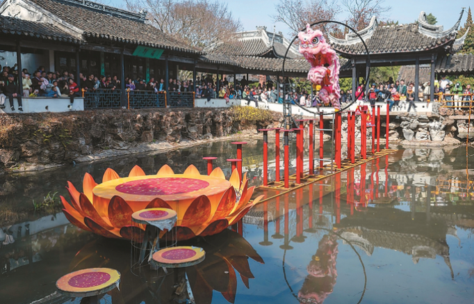 2月15日,无锡惠山古镇举行国家级非遗项目“水上高桩”表演。技艺精湛的表演,引得游客连连惊叹。 潘正光 摄 (视觉江苏网供图)