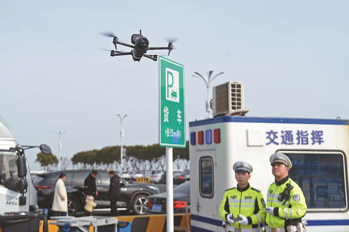 2月23日,春运返程高峰,沪武高速滆湖段车流密集,常州市公安局交管支队高速二大队多措并举,全力保障道路安全畅通。大队强化空地联动,联合高速管理处启用无人机巡查,实时监测路况并通过高空喊话引导车流。夏晨希 摄 (视觉江苏网供图)