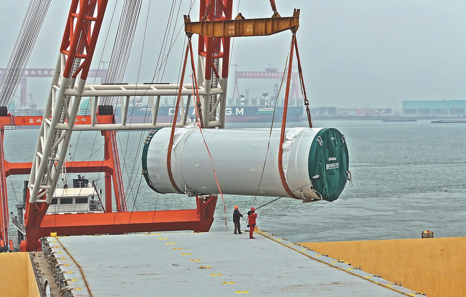 3月6日,常州港新长江码头一片繁忙,一根直径5米、长31米、重70吨的白色风电塔筒被稳稳吊装至“帕纳玛纳”号货轮。作为丙午马年春节后常州港出口的首批风电设备,这批共计88根、总重达6000吨的“巨塔”完成吊装作业后将发往德国,用于当地陆上风电项目建设。夏晨希 摄 (视觉江苏网供图)