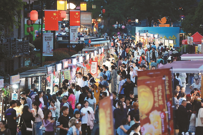 10月4日,国庆假期第4天,淮安市中洲岛运河庙会夜经济火爆,现场人头攒动,游客赏运河美景,逛特色集市,观古建筑剧场演出。