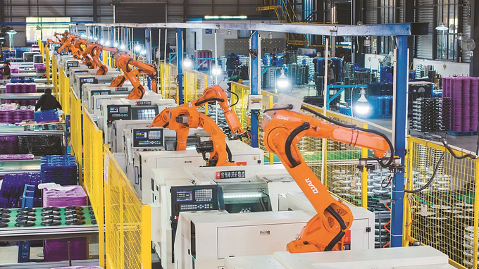 12月3日,金湖县工业园区内,一家企业的机器人正在生产线上忙碌。该企业通过大规模引进国际先进的自动化生产线,不仅实现了生产效率和产品精度的大幅跃升,更在节能降耗、精益生产方面取得显著成效,为当地制造业树立了产业升级的新标杆。冀春阳 陈义宝 摄 (视觉江苏网供图)