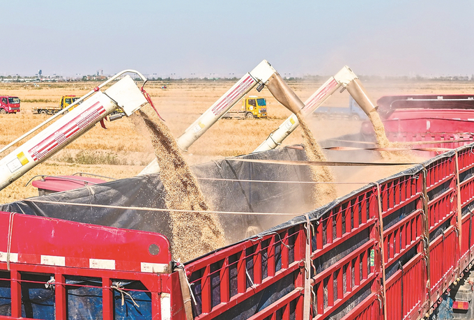 11月12日,连云港市大新农场耐盐碱水稻全面开镰收割,一派热火朝天的丰收景象。近年来,连云港市推进盐碱地综合利用,不断优化盐碱地土壤改良技术,种植适宜盐碱地生长的水稻品种,探索出耐盐碱水稻种植经验和方法。 王健民 王士超 摄 (视觉江苏网供图)