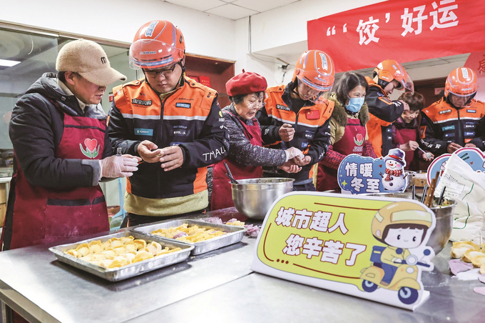 12月16日,连云港市连云区墟沟街道栖霞社区举办“凝‘新’聚力,暖‘新’冬至”活动,邀请外卖骑手等新就业群体与社区居民相聚好苏嫂学校包饺子、话冬至,不仅传递了冬至温情,更切实增强了新业态劳动者对社区的归属感,营造了包容互助的邻里氛围。 王健民 李书颐 摄