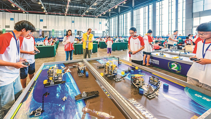 8月3日,世界机器人大赛江苏省选拔赛在南京市溧水区白马农业国际博览中心举行,吸引全省近3000名青少年参赛。世界机器人大赛为机器人界的“奥林匹克”,此次江苏省选拔赛优胜者将晋级全国及国际机器人大赛。朱红生 摄 (视觉江苏网供图)
