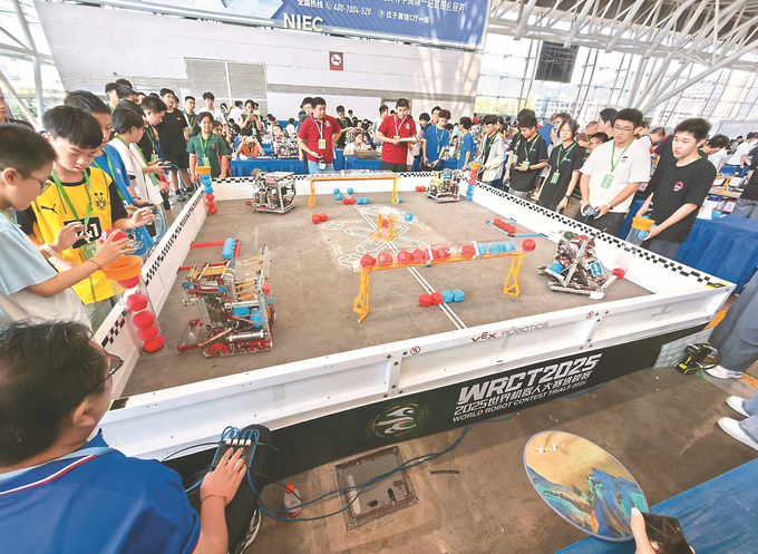8月16日,“智汇金陵·科创争鸣”首届科技竞技主题嘉年华在南京国际展览中心举行。现场智能机器人互动展演、人机对战表演赛等系列活动,为广大青少年打造一场沉浸式科技盛宴。图为人机对战竞技表演。本报记者 宋宁 摄