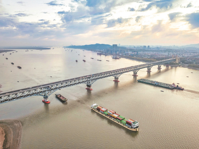 12月27日,伴随着清晨的阳光,长江南京段一艘艘货船装载着生产、生活物资在江面上往来穿梭,呈现一派繁忙景象。“十四五”期间,长江沿线港口吞吐量不断刷新纪录,2025年,长江干线港口货物吞吐量预计达42亿吨,连续20年稳居全球内河航运首位,是名副其实的黄金水道。 杜懿 摄 (视觉江苏网供图)