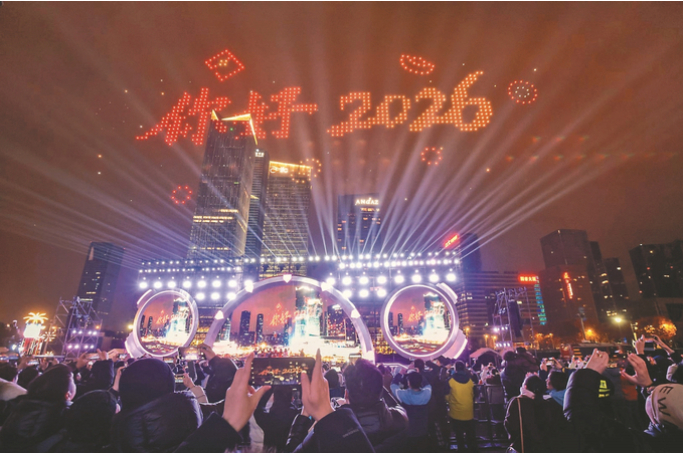 一月一日零点,南京建邺区元通商圈上空,千架无人机腾空交织,以天为幕,以光为笔,在夜空依次勾勒出绚烂图案与新年祝福。璀璨流光点亮城市天际,地面欢呼不绝,人群共同仰望这场科技与艺术交融的光影盛宴,以满怀憧憬的姿态,迎接二〇二六年的到来。 通讯员 方艺舟 本报记者 邵丹 摄
