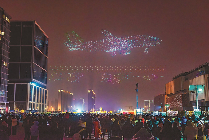 1月17日晚,南京南部新城机场跑道上空,2026架无人机为现场上万名观众奉献了一场震撼的科技光影秀。当晚,第40届秦淮灯会南部新城分会场正式亮灯。