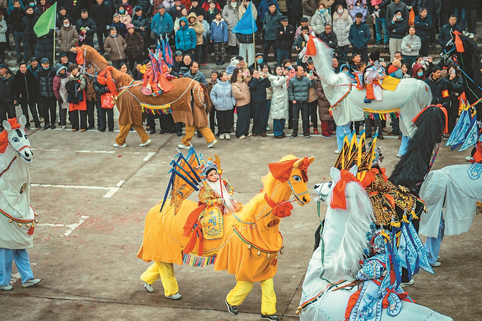 2月7日,南京市高淳区阳江镇丹湖村孙家宕自然村,时隔10余年的百年跑马灯民俗活动再度开启。现场锣鼓铿锵,旗幡飘扬,40人马灯队伍化身三国、杨家将中经典人物,通过灵活多变的阵型,生动演绎这项融舞武戏乐为一体的传统民俗。活动将持续至3月8日,共上演8场。本报记者 邵丹 通讯员 刘列 摄