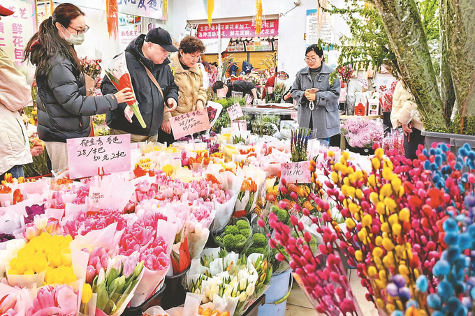 二月十三日,临近春节,南京汉中门花卉市场年宵花迎来销售高峰。据悉,今年年宵花“顶流”依旧是蝴蝶兰,玫瑰、郁金香、蜡梅、金橘及“五代同堂果”等也很走俏。 本报记者 刘莉 摄