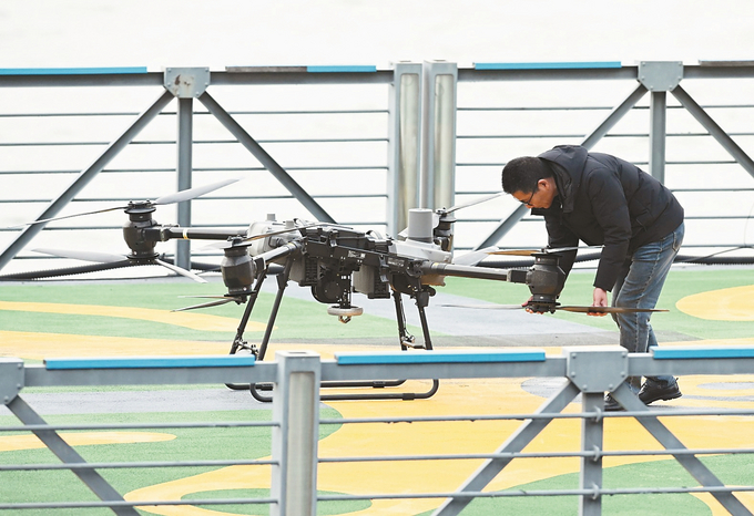 3月6日下午,十四届全国人大四次会议经济主题记者会举行。国家发展和改革委员会主任郑栅洁在回应记者有关智能机器人等新兴支柱产业的提问时,特别提到了现在流行的一则短视频,点赞无人机在长江南京段送外卖。图为3月6日,南京市鼓楼区江翼达飞行基地,工作人员正在检查长江上为船舶送外卖的无人机。本报记者 吴俊 摄