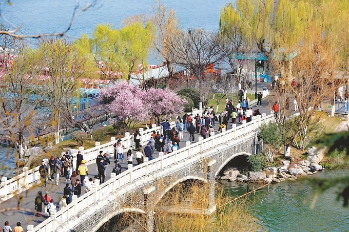 3月12日天气晴好,南京玄武湖公园内春色撩人,呈现出一派生机盎然的景象。众多市民与游客穿梭于花海之中,或驻足拍照,或漫步赏景,尽情享受明媚春光与满园花色。本报记者 刘莉 摄
