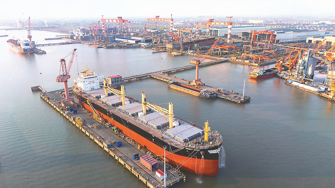 2月13日,位于南通市通州区的南通象屿海洋装备有限责任公司船坞内,生产繁忙有序。新春伊始,通州区各船企开足马力,工人们加快生产进度赶订单,力争实现“开门红”。 翟慧勇 摄 (视觉江苏网供图)