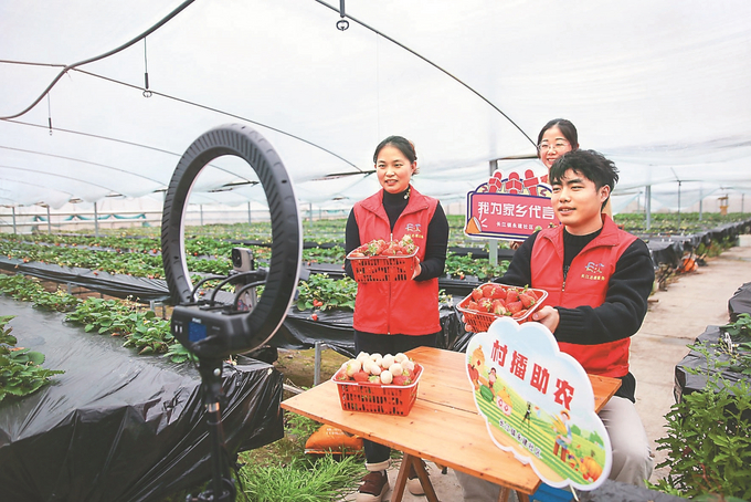 2月14日,在如皋市长江镇永建社区一高架草莓种植基地,当地“村播”通过直播平台宣传、销售家乡草莓。 徐慧 摄 (视觉江苏网供图)