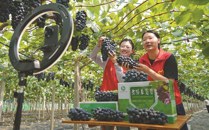连日来,海安市墩头镇各村党组织组建党员服务队开展“直播助农拓销路”公益活动,党员志愿者走进田间地头,现场直播带货,帮助农民推销农产品。 图为7月1日,海安市墩头镇墩西村一处葡萄大棚内,青年党员志愿者正在直播带货,助农销售葡萄。周强 摄 (视觉江苏网供图)