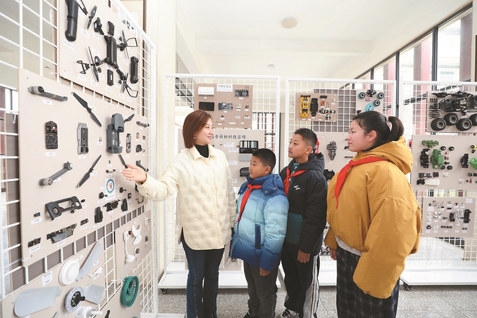 12月23日,在海安市南屏小学举办的校园科技节“拆拆乐”活动中,学生们在老师指导下将废旧无人机、笔记本电脑等物品拆解成零件,于探索中激发科技兴趣。图为老师和学生一起参观废旧物品零部件展览。 顾彬斌 摄 (视觉江苏网供图)