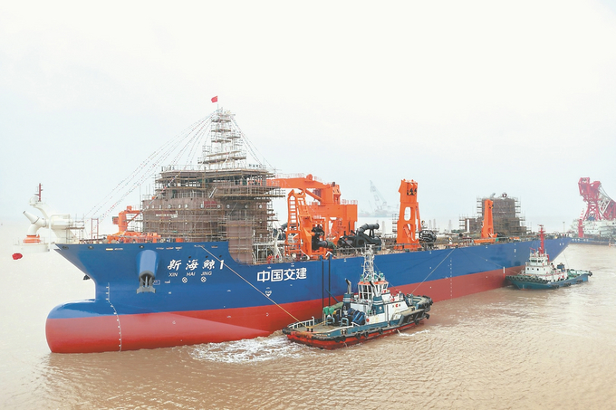3月6日,由中交上航局投资、上海振华重工集团承建的国内首艘分布式舱内泥泵设计25000立方米舱容等级特大型自航耙吸挖泥船在振华启东海工顺利下水。该船建成后,可胜任深海取砂、沿海深水港口航道疏浚、海岸维护等重大工程。 许丛军 摄 (视觉江苏网供图)