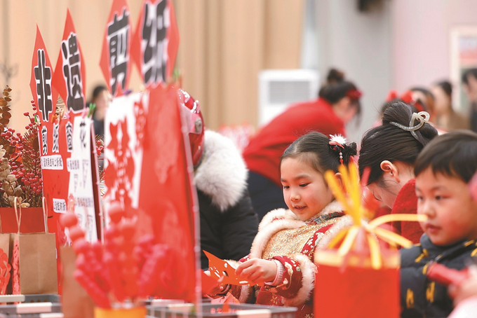 1月13日,泗洪县长江路幼儿园组织开展了以非遗为主题的亲子游园活动,让孩子们了解中国传统文化,在知民俗、品年味中迎接新年。图为小朋友们在体验刻纸。许昌亮 摄 (视觉江苏网供图)