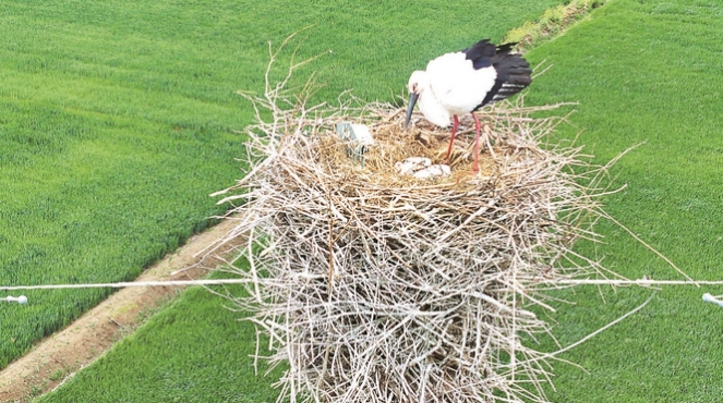 4月12日,泗洪县上塘镇,一对国家一级保护动物东方白鹳于电线杆塔上守护4只幼鸟,成为当地生态环境持续改善的生动例证。