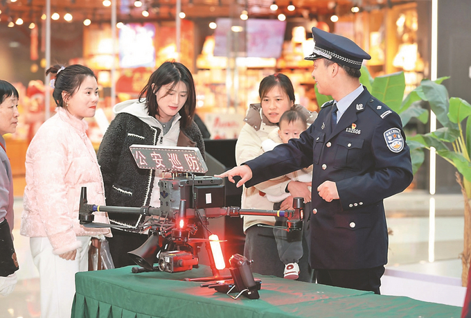 1月10日,在宿迁市公安局宿豫分局举行的110宣传活动中,民警向市民介绍警用无人机装备。 王力 摄 (视觉江苏网供图)