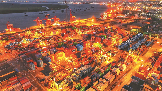 7月22日晚,苏州港张家港港区集装箱码头灯火通明,货轮在泊位上有序装卸货物,一派繁忙景象。今年上半年,苏州市货物贸易进出口总值1.3万亿元,同比增长5.7%,占同期全国、全省进出口总值的5.9%、46%,进出口规模创同期历史新高。 施柏荣 摄 (视觉江苏网供图)