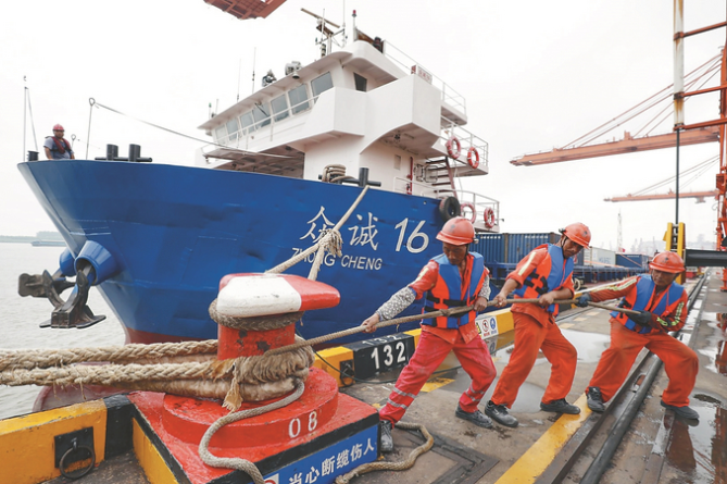 9月24日,张家港保税科技(集团)股份有限公司员工对停靠在码头的船舶进行带缆加固和巡查,防范台风“桦加沙”影响。 施柏荣 摄(视觉江苏网供图)