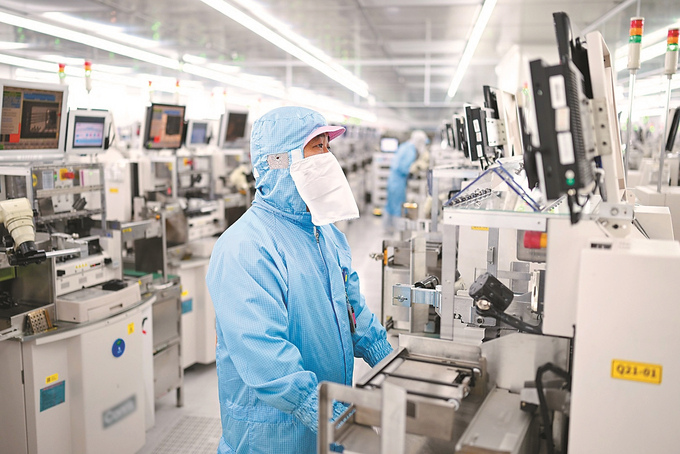 10月20日,在苏宿工业园区的长电科技(宿迁)有限公司,工人在半导体封装测试生产线上忙碌。该公司是一家专注于半导体封测的企业,产品主要应用于汽车电子、手机、家电等智能设备。 方东旭 摄 (视觉江苏网供图)