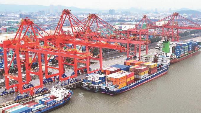 1月20日,苏州港张家港港区集装箱码头,船舶在泊位有序装卸货物,一派繁忙景象。 施柏荣 摄 (视觉江苏网供图)