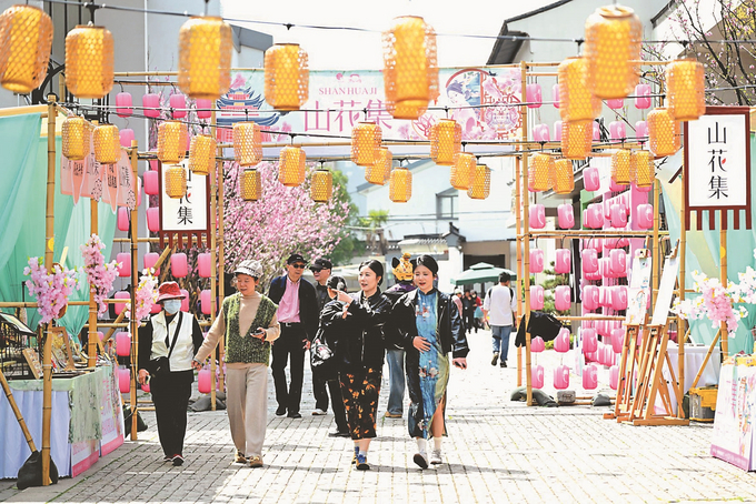 3月28日,“山花集”在苏州市桃花坞历史文化片区开市,市集汇聚了宋锦、缂丝、手工版画、鱼灯花灯等60余项特色项目,吸引市民和游客前来近距离赏技艺、淘好物、品民俗。 管钰楠 摄 (视觉江苏网供图)