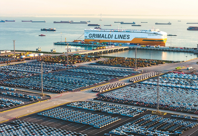 4月26日,全新专业汽车滚装船“英格兰盛世”轮顺利靠泊苏州港太仓港区码头,大批国产汽车平稳滚装上船。近年来,国产汽车核心竞争力持续提升,整车出口势头强劲。依托港口区位与物流优势,越来越多的中国制造汽车从长三角港口出海。 孔繁立 摄 (视觉江苏网供图)
