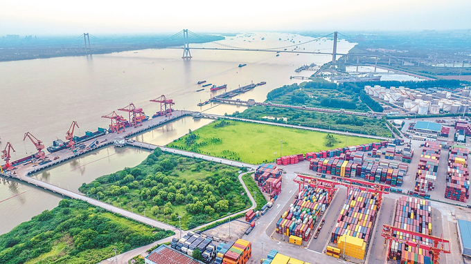 泰州港围绕半年目标任务,按下生产“快进键”,努力实现港口集装箱、货物、外贸吞吐量再创新高。图为6月29日航拍的泰州港。 周社根 摄 (视觉江苏网供图)