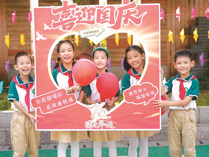 昨日,泰州市姜堰区东桥小学教育集团东板桥校区组织了丰富多彩的迎国庆主题活动,孩子们在欢乐氛围中抒发对祖国的热爱,献上诚挚祝福。 周社根 摄 (视觉江苏网供图)