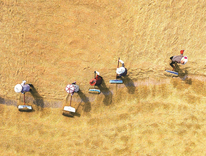 秋收时节,泰州市海陵区国家现代农业产业园的制种水稻迎来收获季。图为农民在晒场上翻晒稻谷。顾继红 摄 (视觉江苏网供图)