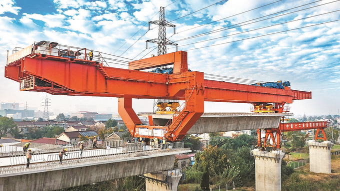 目前天气是户外作业黄金时段,承担沪渝蓉高铁泰州段施工的中铁十二局等单位,抢抓有利时机加快施工进度,确保工期按时完成。图为11月6日清晨,正在泰州段第710跨梁施工的工人们开始铁路梁铺设工作,运梁机将32米长、重约740吨的预制梁送至架梁机,由架梁机进行精准吊装。 许大才 常文旺 摄(视觉江苏网供图)