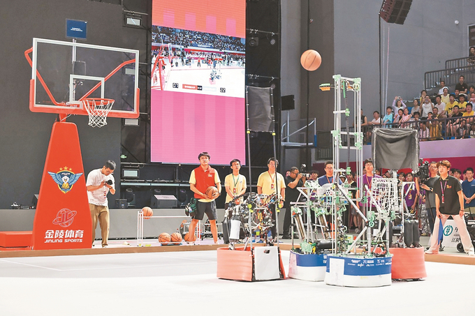 7月15日,第二十四届全国大学生机器人大赛ROBOCON(江阴赛)决赛在南京理工大学江阴校区举行。来自全国76所高校的3000余名大学生在“飞身上篮”机器人篮球赛、机器人排球赛、仿生足式挑战赛三大赛项中展开角逐。图为“飞身上篮”机器人篮球赛决赛现场。 朱吉鹏 摄(视觉江苏网供图)