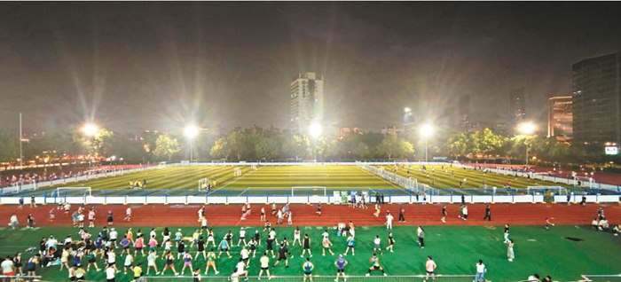 8月1日晚,市民们在恢复开放的市体育公园体育场锻炼。7月中旬开始,市体育集团将体育场临时封闭,进行改造升级,以提高运动场的安全水平,提升群众运动体验。升级后,田径跑道内的足球场四周全部用钢制护栏封闭,划分出了2片8人制足球场和3片5人制足球场,为青少年足球训练和成人足球锻炼提供了优质的场地条件,做到跑步与足球互不干扰。此外,体育场四周的照明设施全部更换,为市民夜间锻炼优化了照明环境。