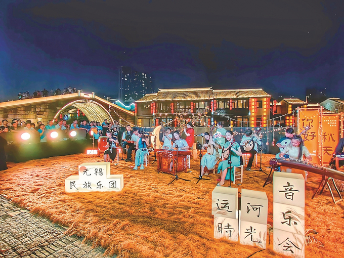 10月12日晚,无锡民族乐团在南长街清名桥畔上演“运河时光”音乐会,现场演奏《无锡景》《浮光》等12首耳熟能详的乐曲,让市民游客近距离感受视听盛宴。 钦嫣 摄 (视觉江苏网供图)