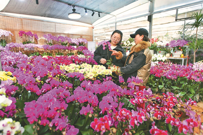 12月15日,市民在位于徐州市云龙区潘塘街道潘塘社区的徐州花木大世界赏花、购花。目前,该花卉市场年宵花销售日渐红火,蝴蝶兰等年宵花逐渐成为徐州市民节庆装扮房间的选择之一。 蒯创 摄 (视觉江苏网供图)