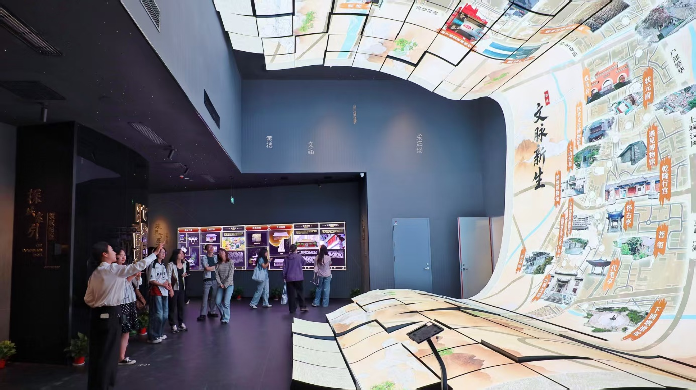 “彭城七里”数字体验馆,更是年轻人的“心头好”。作为彭城七里的文脉原点,这里纵贯城市南北中轴,一馆便能尽览徐州千年风华,既是唤醒文脉记忆的新起点,也是彰显彭城底蕴的新名片。数字馆以“穿行彭城”为体验主题,循着时间演进的暗线,精心打造“纪年之轴”“长河古卷”“彭城幻境”“七里图鉴”四大沉浸式篇章。采风团成员穿行其中,仿佛真的穿越回那些激荡人心的过往朝代。