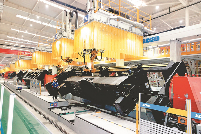 近年来,徐州市工程机械产业持续领跑发展,已形成千亿级产业集群,跻身国家首批先进制造业集群,正在打造世界级工程机械产业集群。图为2月26日,工人在徐工集团高端起重装备智能生产车间忙生产。蒯创 摄 (视觉江苏网供图)