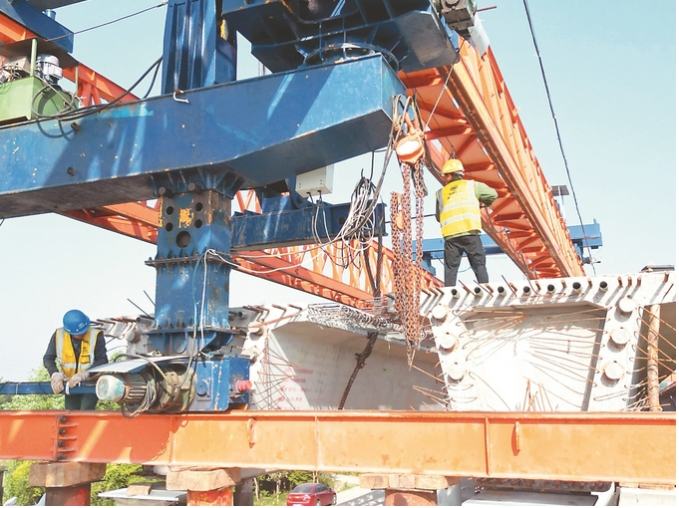 5月2日,东台市东兴高速泰东河大桥预制箱梁架设现场,中铁十五局的施工人员在劳动中度过节日。练益华 摄 (视觉江苏网供图)