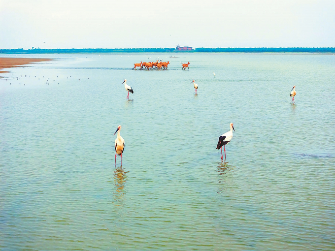 9月13日,盐城东台条子泥湿地出现东方白鹳与麋鹿同框的罕见画面,数只东方白鹳在水中觅食,一群麋鹿悠然而过。 孔繁立 摄 (视觉江苏网供图)